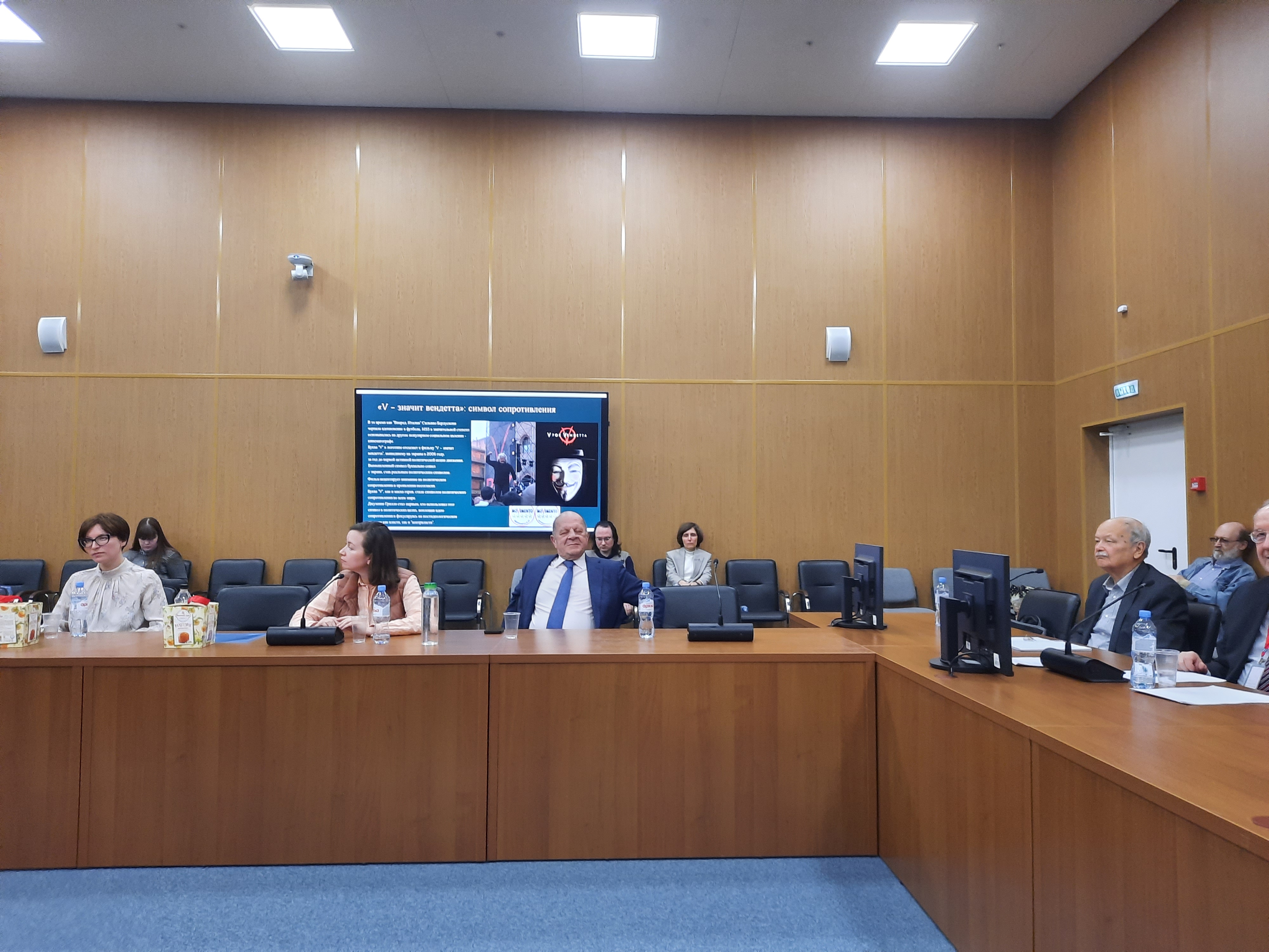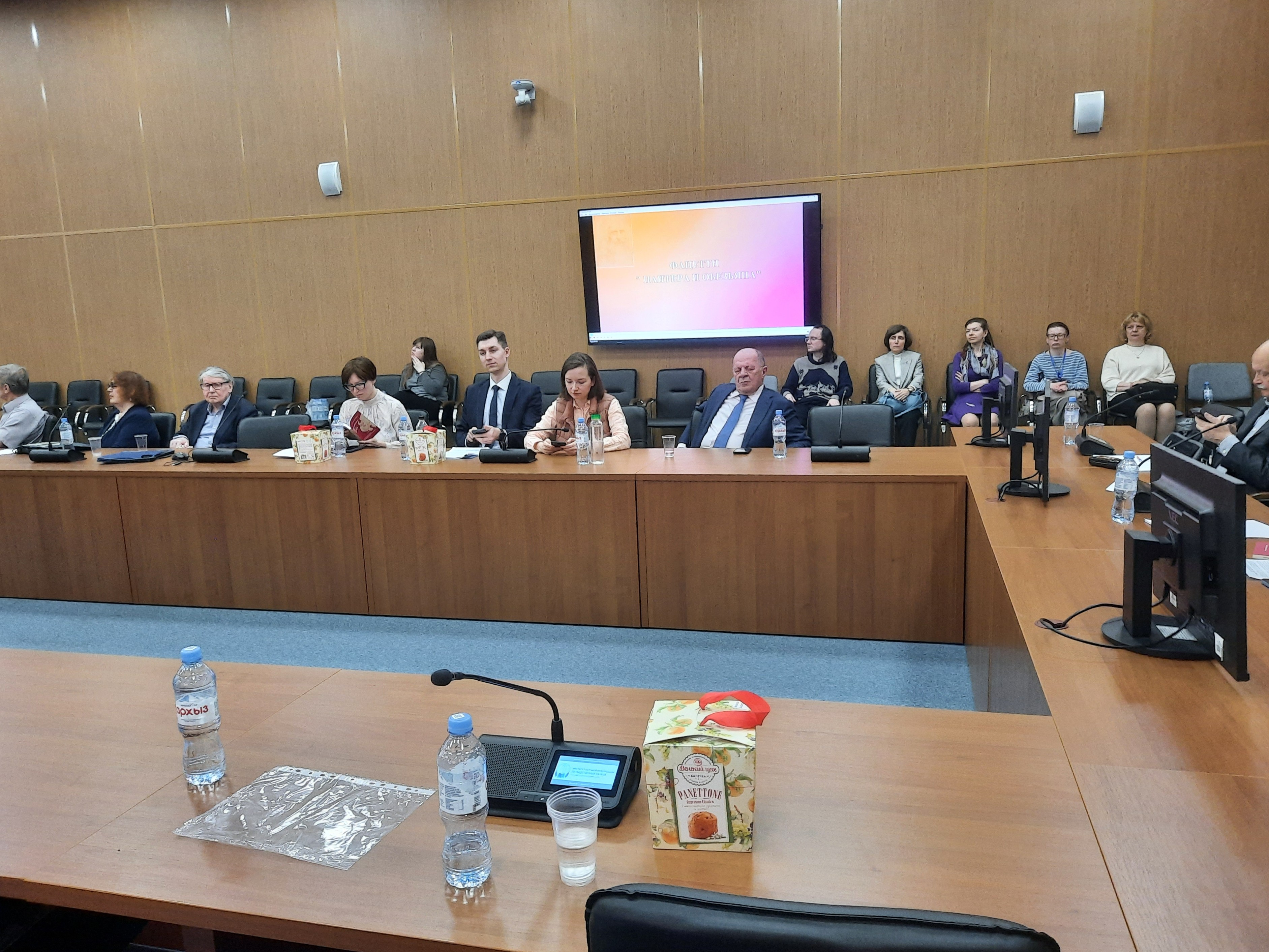 В начале встречи трём докладчикам был вручен в подарок в преддверии наступающей Пасхи итальянский кулич - «панеттоне». Заседание вызвало большой интерес у профессионального экспертного сообщества (в зале присутствовали 24, в онлайн 13 участников). Были представлены доклады: