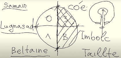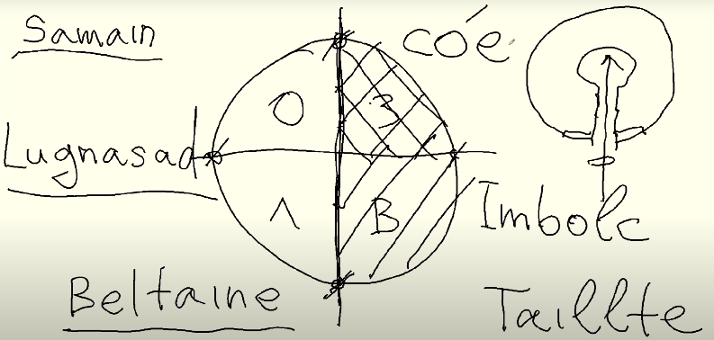 Первая бинарная оппозиция – ноябрь /Samain (Саунь) и май /Beltaine (Белтайне). Другая бинарная оппозиция реперных точек февраль /Imbolc (Имболк) и август /Lugnasad (Лугнасад). От Саунь до Белтайне длилась темная половина года, а от Бельтайне до Саунь – светлая.