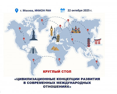 22 октября 2025 года Отдел Ближнего и Постсоветского Востока и Центр междисциплинарных исследований ИНИОН РАН проводит в г. Москве круглый стол «Цивилизационные концепции развития в современных международных отношениях». К участию приглашаются ученые, педагоги, аспиранты, магистранты.