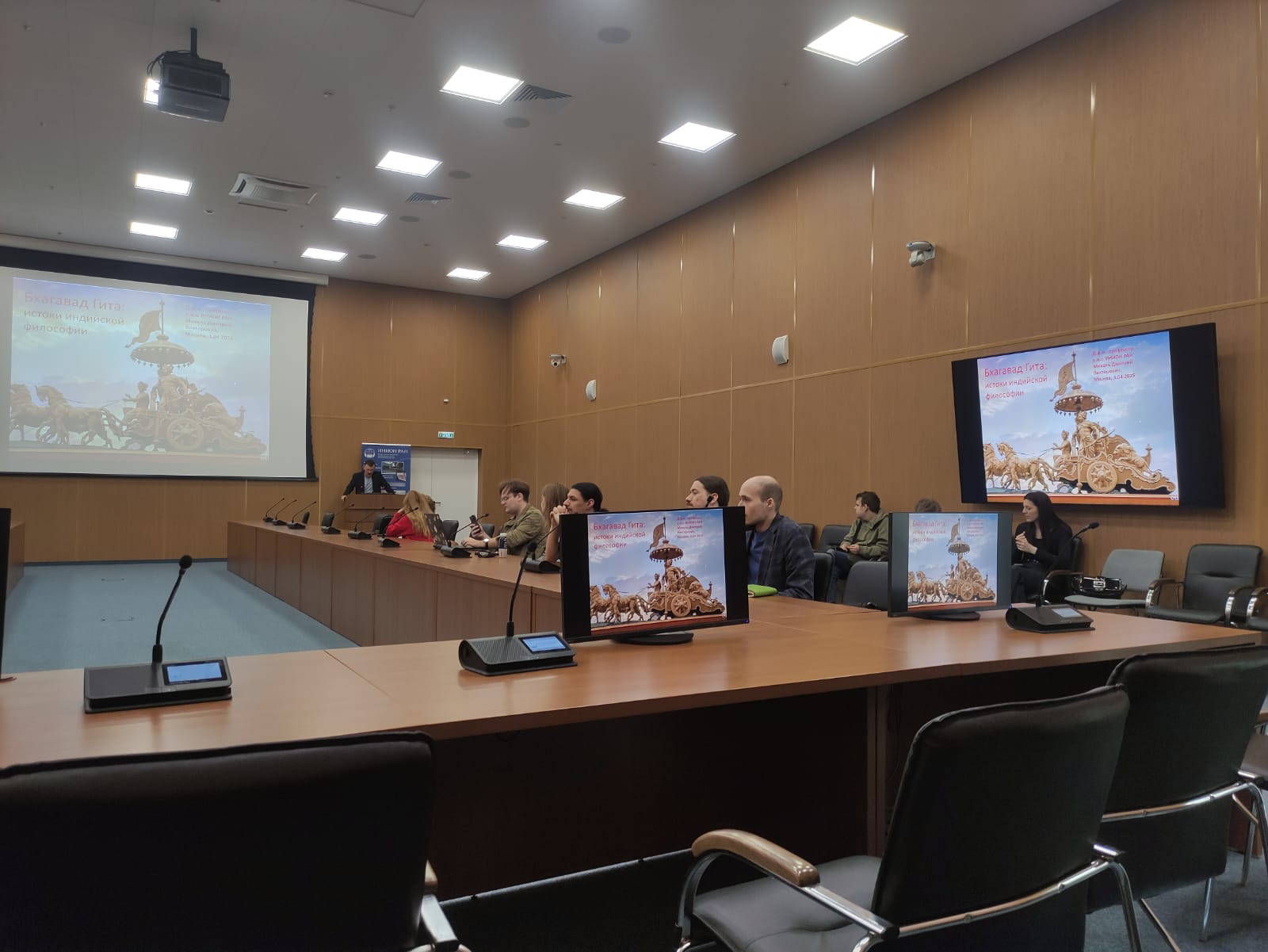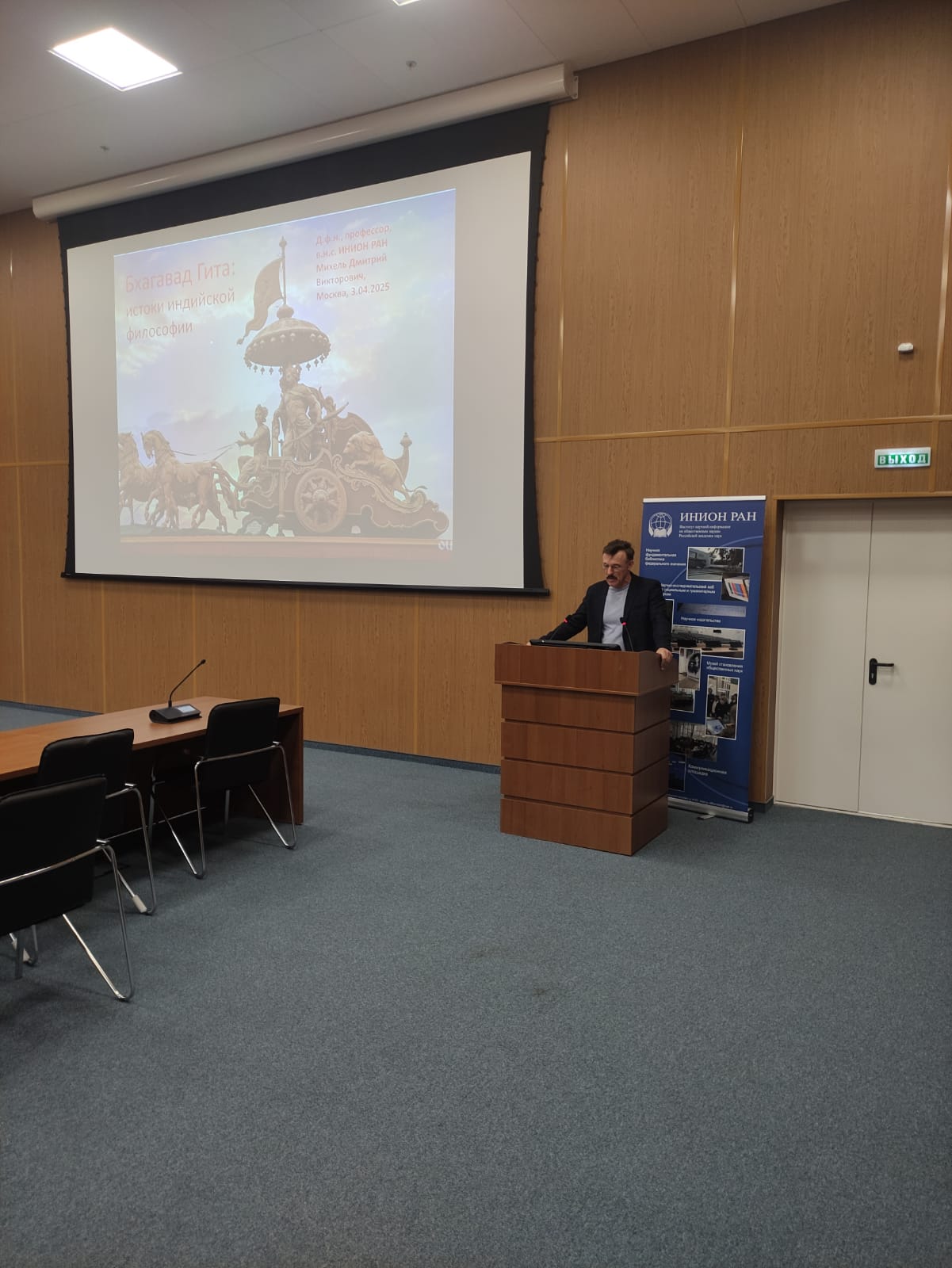3 апреля 2025 года в зале заседаний Ученого совета ИНИОН РАН состоялась лекция «Бхагавад Гита: истоки индийской философии». Ведущий научный сотрудник Отдела Азии и Африки д.ф.н., профессор Дмитрий Викторович Михель рассказал об основных философских смыслах «Бхагавад Гиты» —одного из самых значительных памятников мировой словесности и шедевра индийской философской литературы.