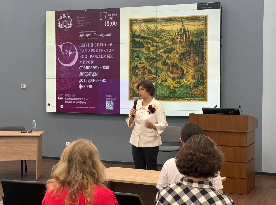 17 сентября 2025 года состоялась лекция Елены Владимировны Халтрин-Халтуриной (д-р. филол. наук, PhD в области английской филологии, в.н.с. ИМЛИ РАН) «Эдмунд Спенсер как архитектор воображаемых миров: от елизаветинской литературы до современных фэнтези».