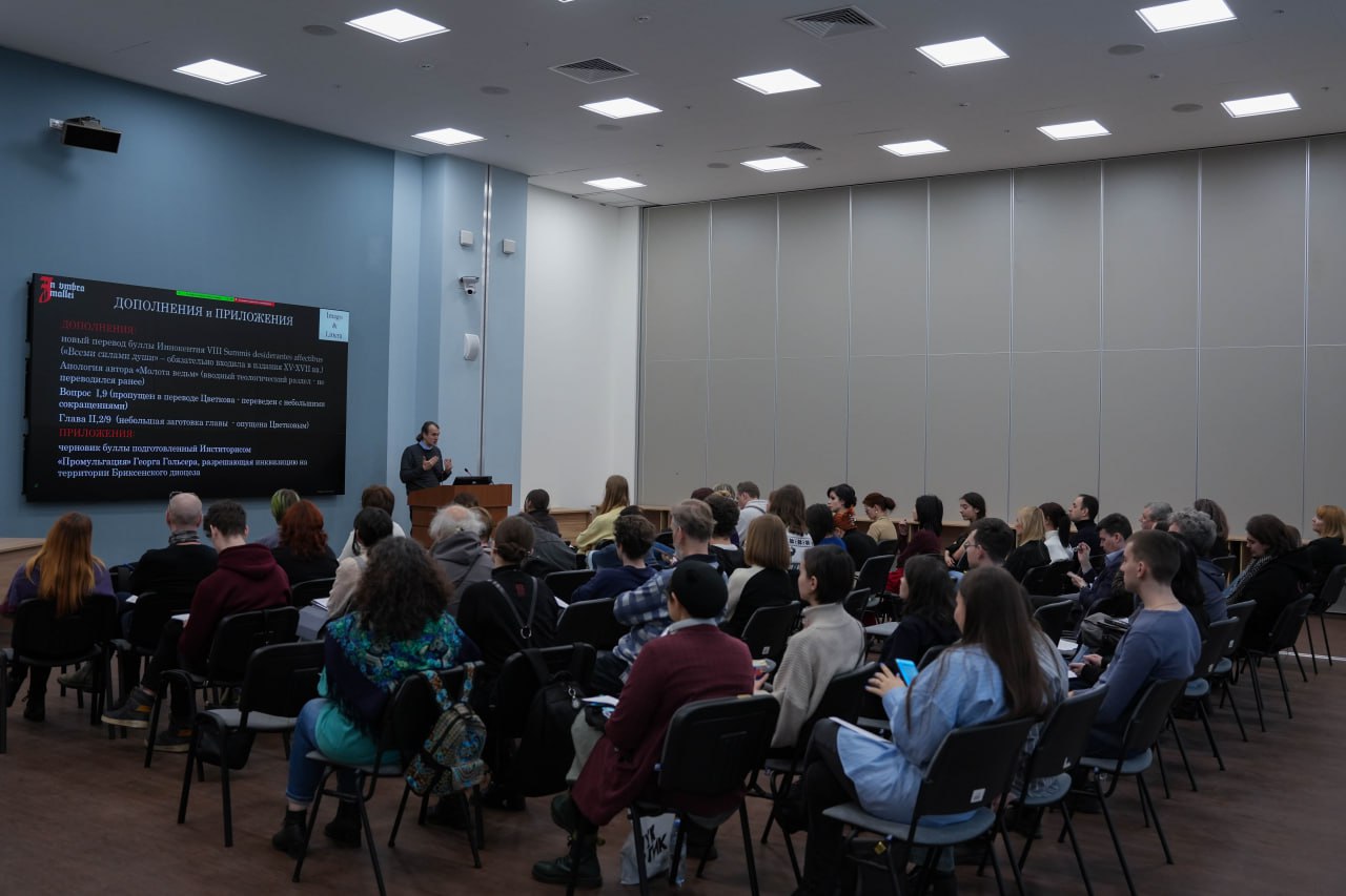 Научный сотрудник Центра междисциплинарных исследований ИНИОН РАН, историк-медиевист Григорий Владимирович Бакус представил исследовательский проект, посвященный ранним итальянским демонологическим сочинениям. В ходе лекции была предпринята попытка увидеть ситуацию противоречивого культурного диалога. Апеллируя к опыту своих коллег «брат Генрих» пытался обосновать собственное понимание необходимости преследования ведьм как общую позицию доминиканцев.
