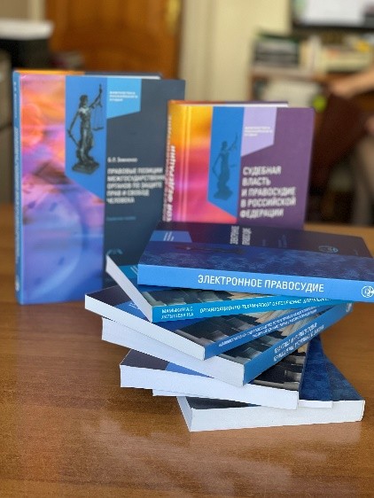 На выставке также размещены книги ученых, преподавателей РГУП, судей и работников аппарата судов.