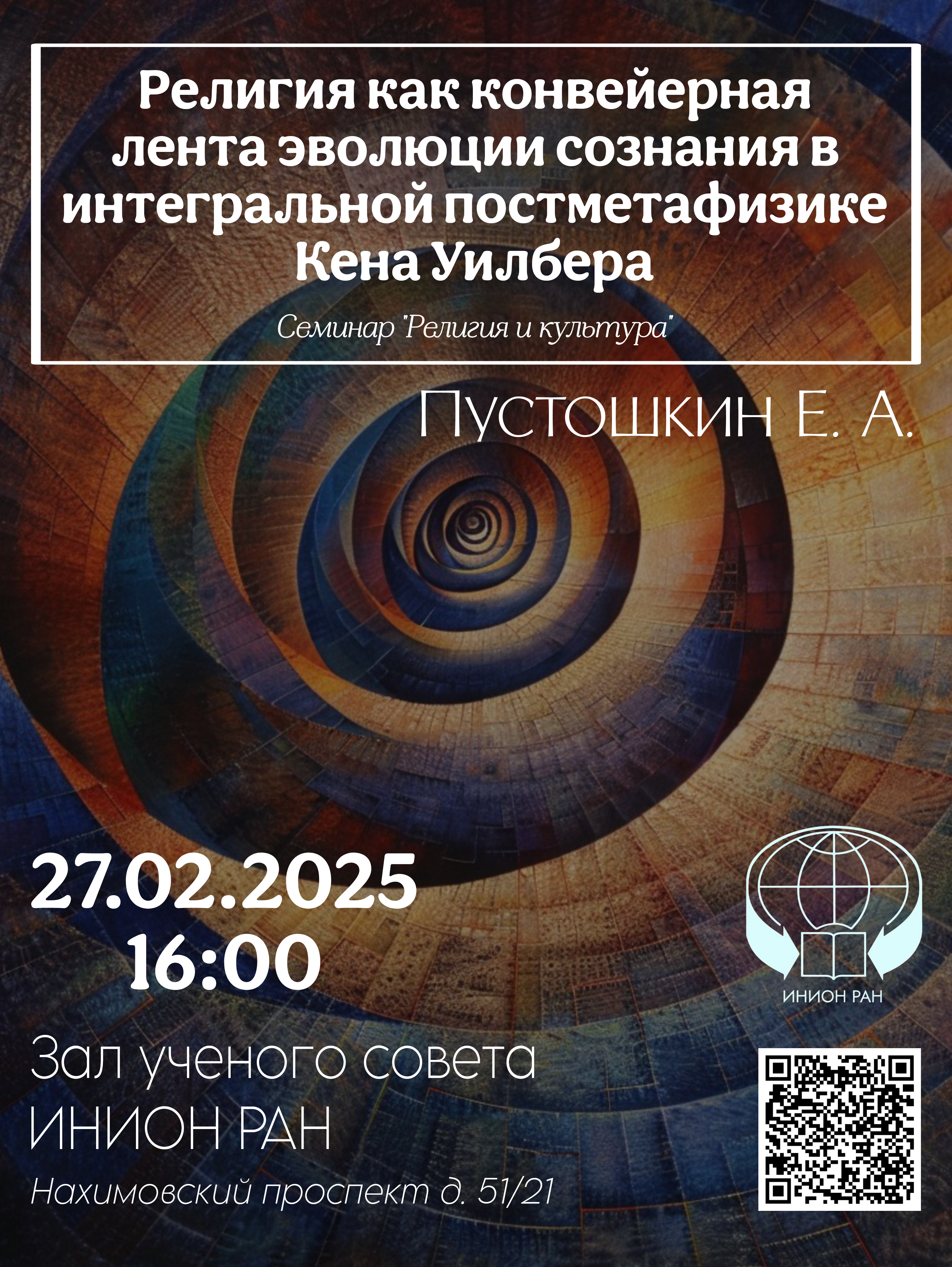 В четверг 27 февраля 2025 года в 16:00 в зале заседаний Ученого совета пройдет очередной научный семинар «Религия и культура». Организаторами семинара являются Отделы философии и культурологии ИНИОН РАН.
