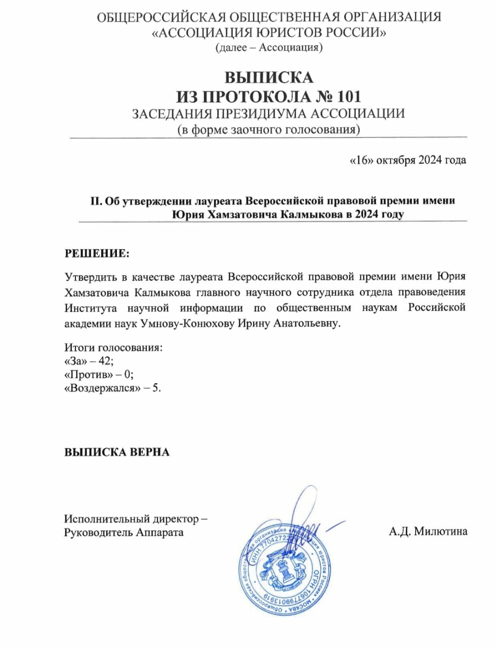 Ирина Анатольевна Умнова-Конюхова, главный научный сотрудник отдела правоведения, главный редактор информационно-аналитического журнала «Социальные и гуманитарные науки: Отечественная и зарубежная литература. серия «Государство и право», доктор юридических наук, профессор, Почетный работник высшего образования стала лауреатом Всероссийской правовой премии имени Ю. Х. Калмыкова «За честь и достоинство», учрежденной Общероссийской общественной организацией «Ассоциация юристов России». Премия является формой признания особых заслуг в развитии правовой мысли России и активной гражданской позиции. Ассоциация юристов России ежегодно присуждает одну Премию. Основными критериями присуждения Премии являются: существенный вклад в формирование правового государства, укрепление законности и правопорядка, защиту прав и законных интересов граждан; значительный вклад в совершенствование законодательства Российской Федерации; общественное признание заслуг юриста; социально значимая деятельность; крупный вклад в развитие российской правовой науки; вклад в развитие российского юридического образования, подготовку квалифицированных юридических кадров. Всем этим критериям отвечает Ирина Анатольевна.