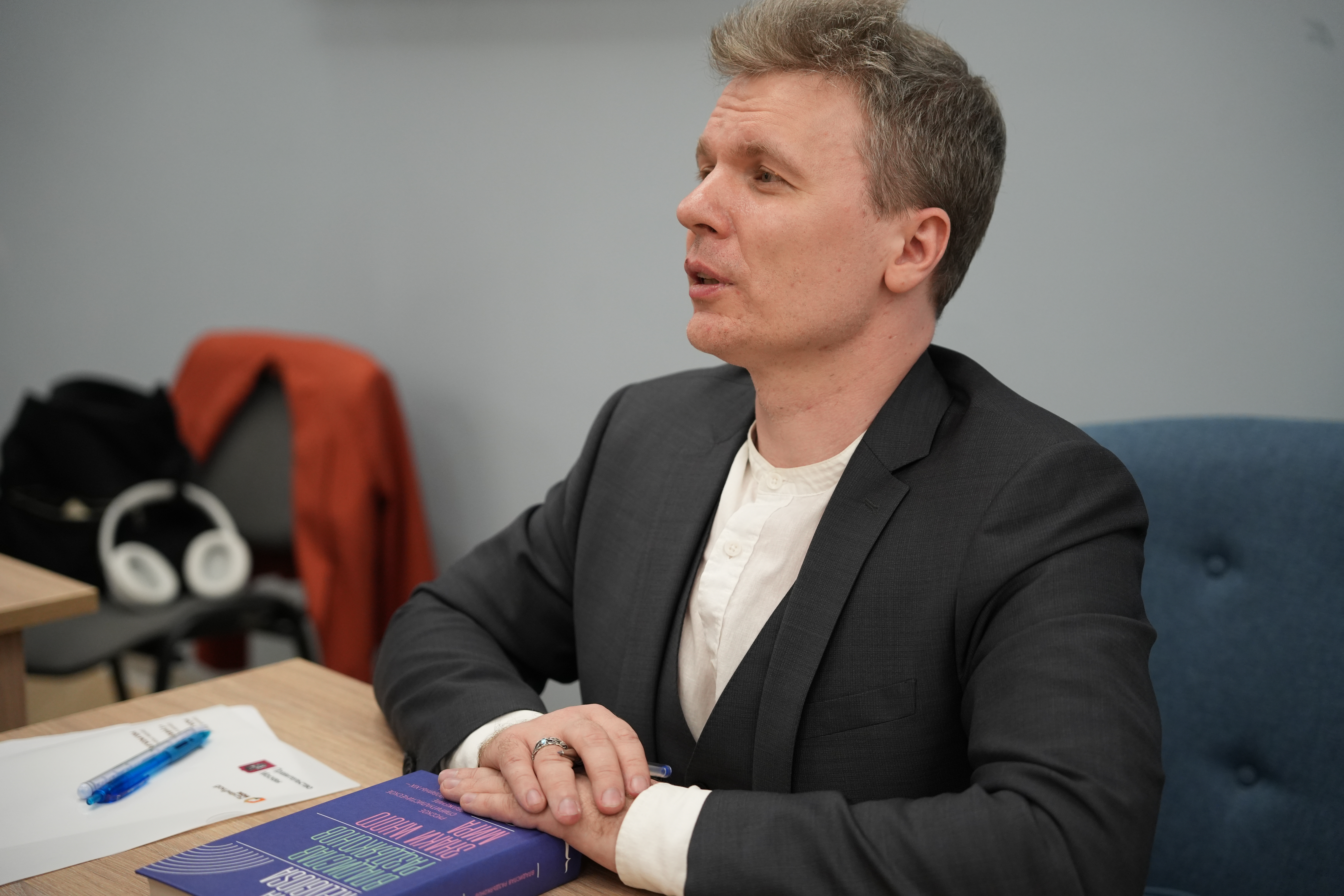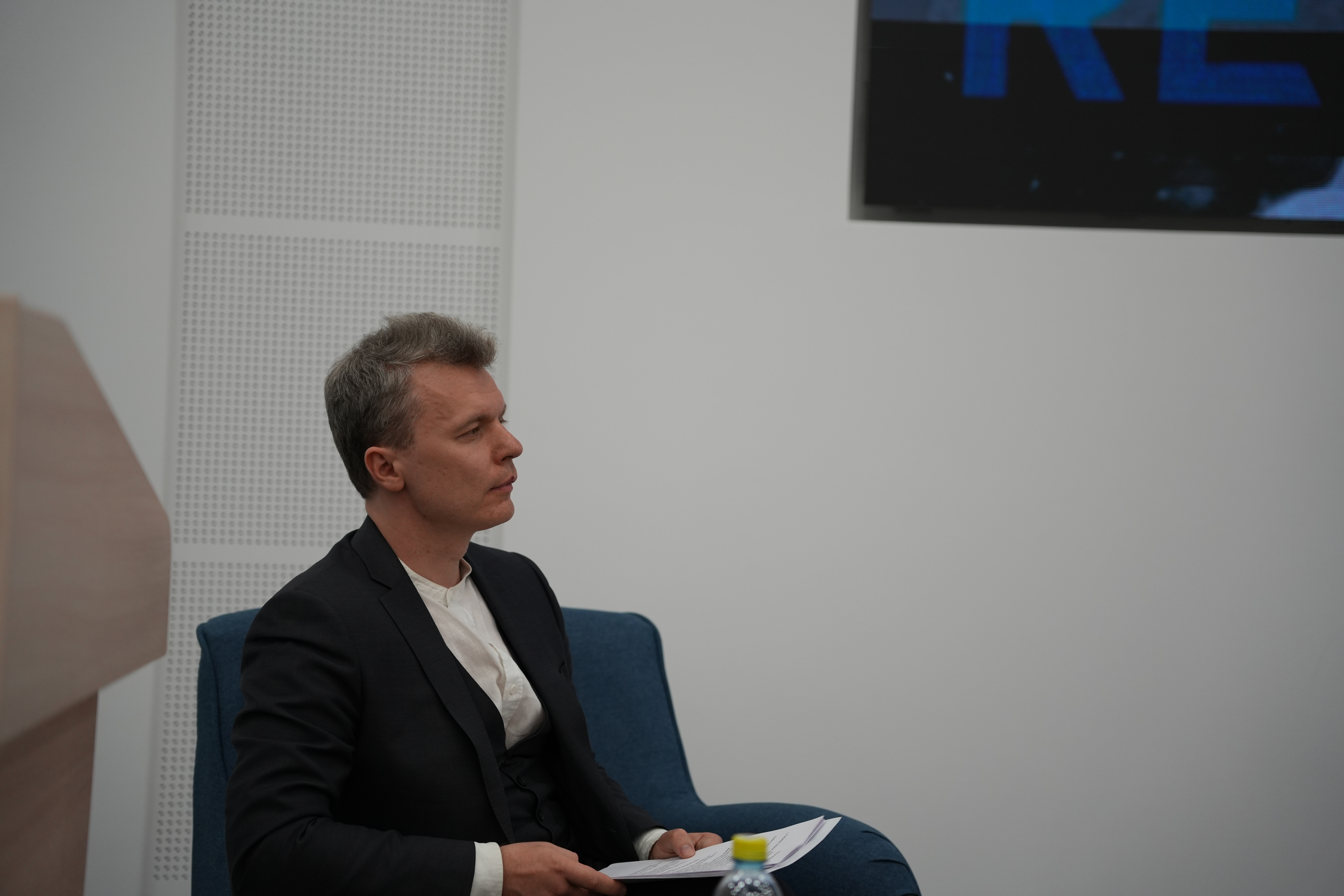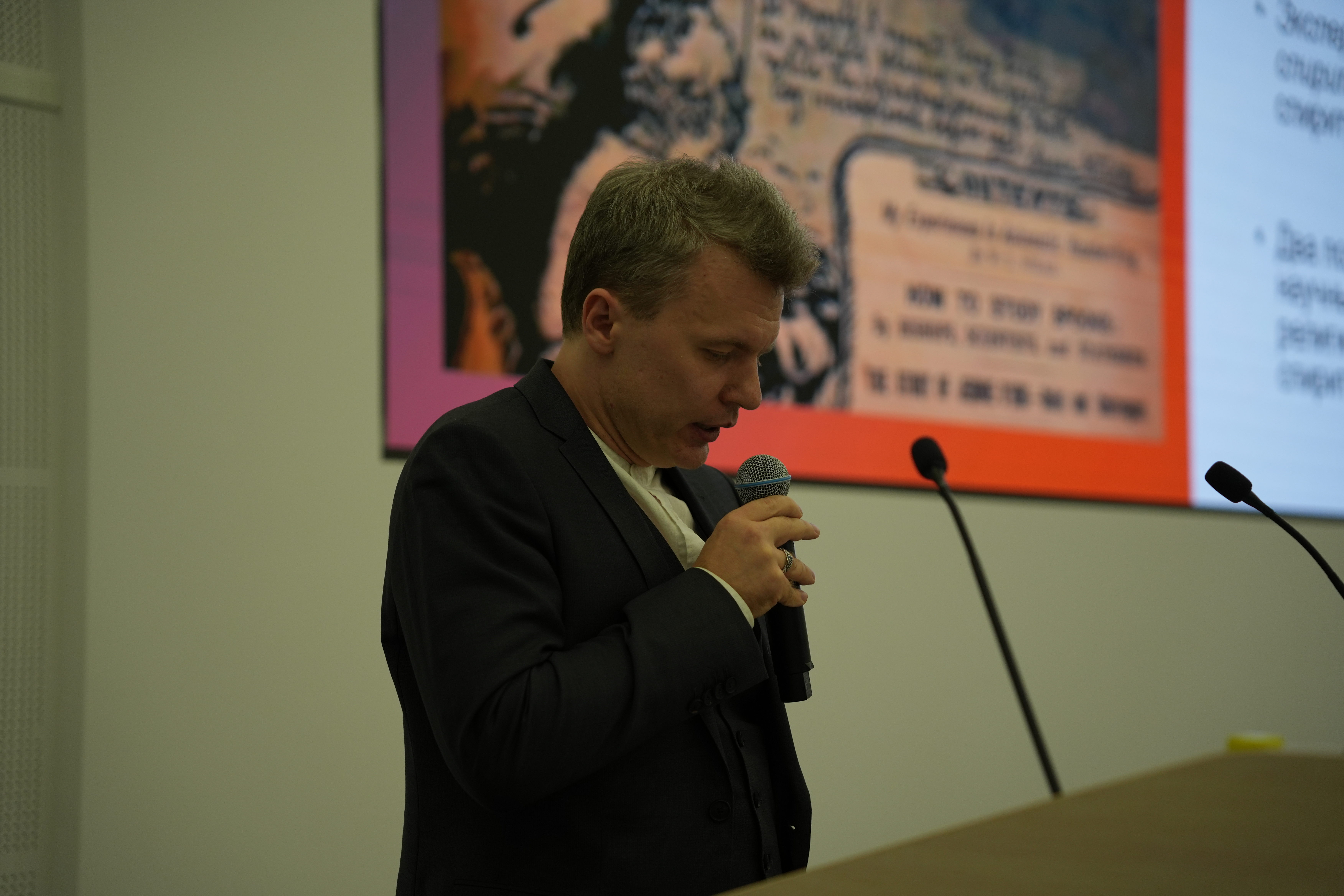 Далее слово было передано заведующему Отделом философии, д.ф.н. Сергею Мельнику, который поприветствовал слушателей лектория, организаторов мероприятия и команду издательства «Новое литературное обозрение» и анонсировал будущие мероприятия Отдела философии.