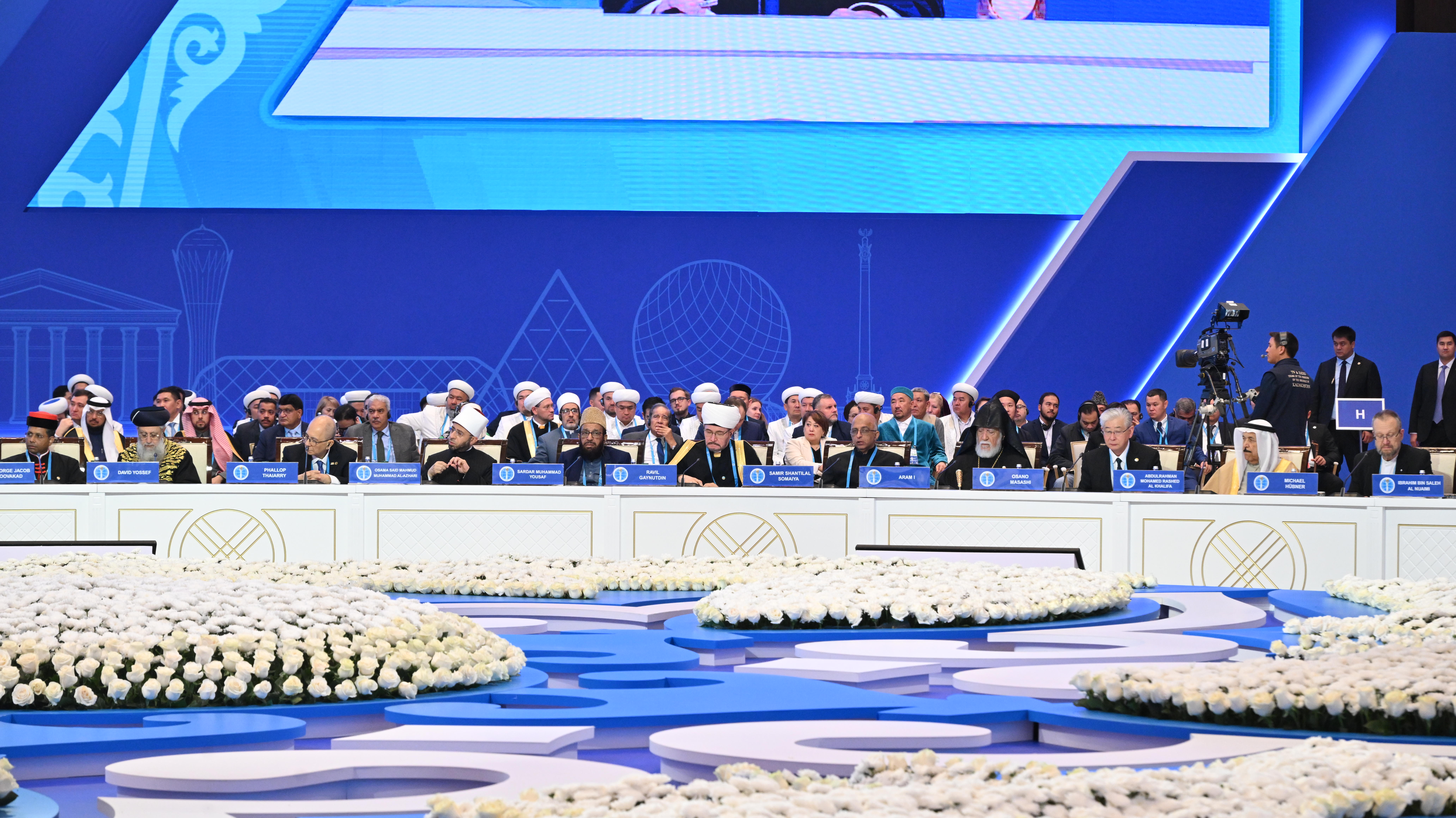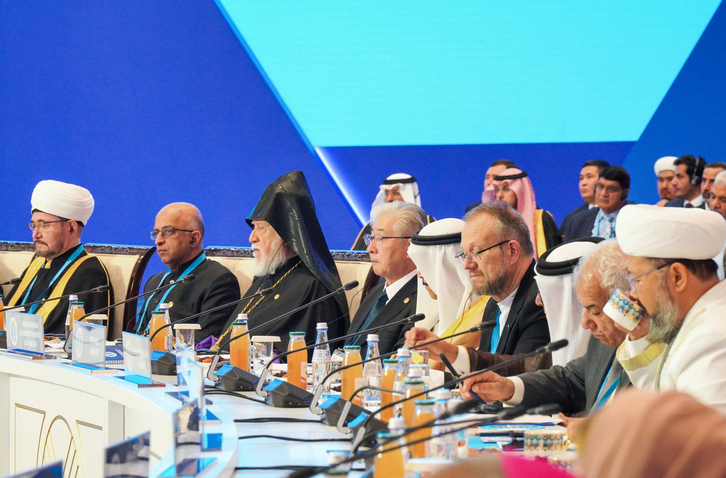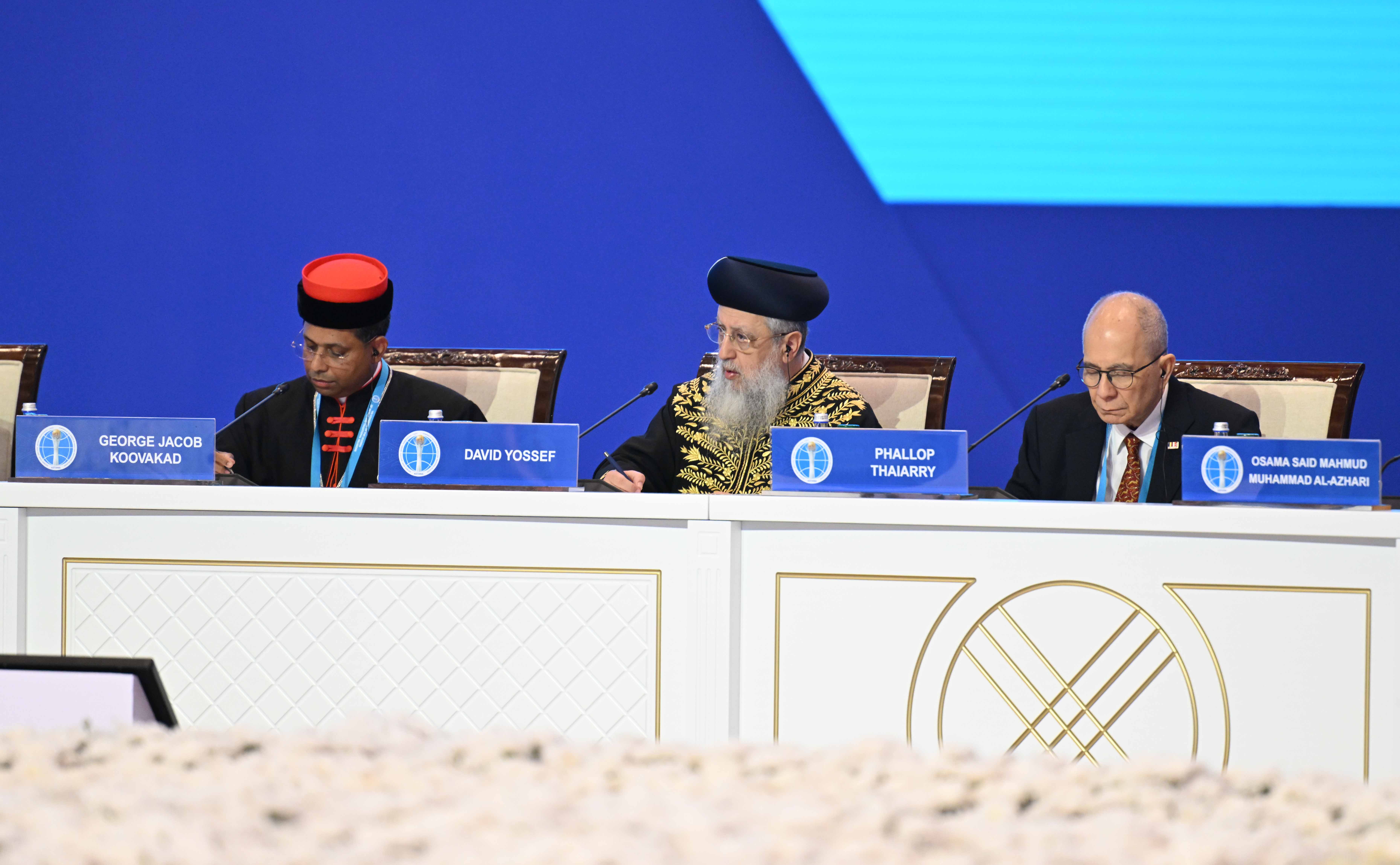исламской лиги М.А. Аль-Исса, глава Дикастерии по межрелигиозному диалогу Римско-Католической Церкви кардинал Д.Д. Коовакад, который огласил приветствие Папы Льва XIV, Блаженнейший Патриарх Иерусалимский Феофил III, представитель Генерального секретаря ООН по Альянсу цивилизаций М.А. Моратинос, Католикос Великого Дома Киликийского Арам I, председатель Управления мусульман Кавказа шейх-уль-ислам Аллахшукюр Пашазаде, руководитель Организации по культуре и исламским связям Ирана ходжат-уль-ислам М.М. Иманипур, главный (ашкеназский) раввин Израиля К. Бер, председатель Духовного управления мусульман РФ муфтий шейх Равиль Гайнутдин, председатель Генерального управления по делам ислама, вакуфов и закята ОАЭ О.Х. Ад-Дареи, президент университета Somaiya Vidyavihar (Индия) С.Ш. Сомайя; президент Всемирного братства буддистов (Тайланд) Ф. Тайари, председатель Ассоциации даосистов Китая Ли Гуанфу и другие.