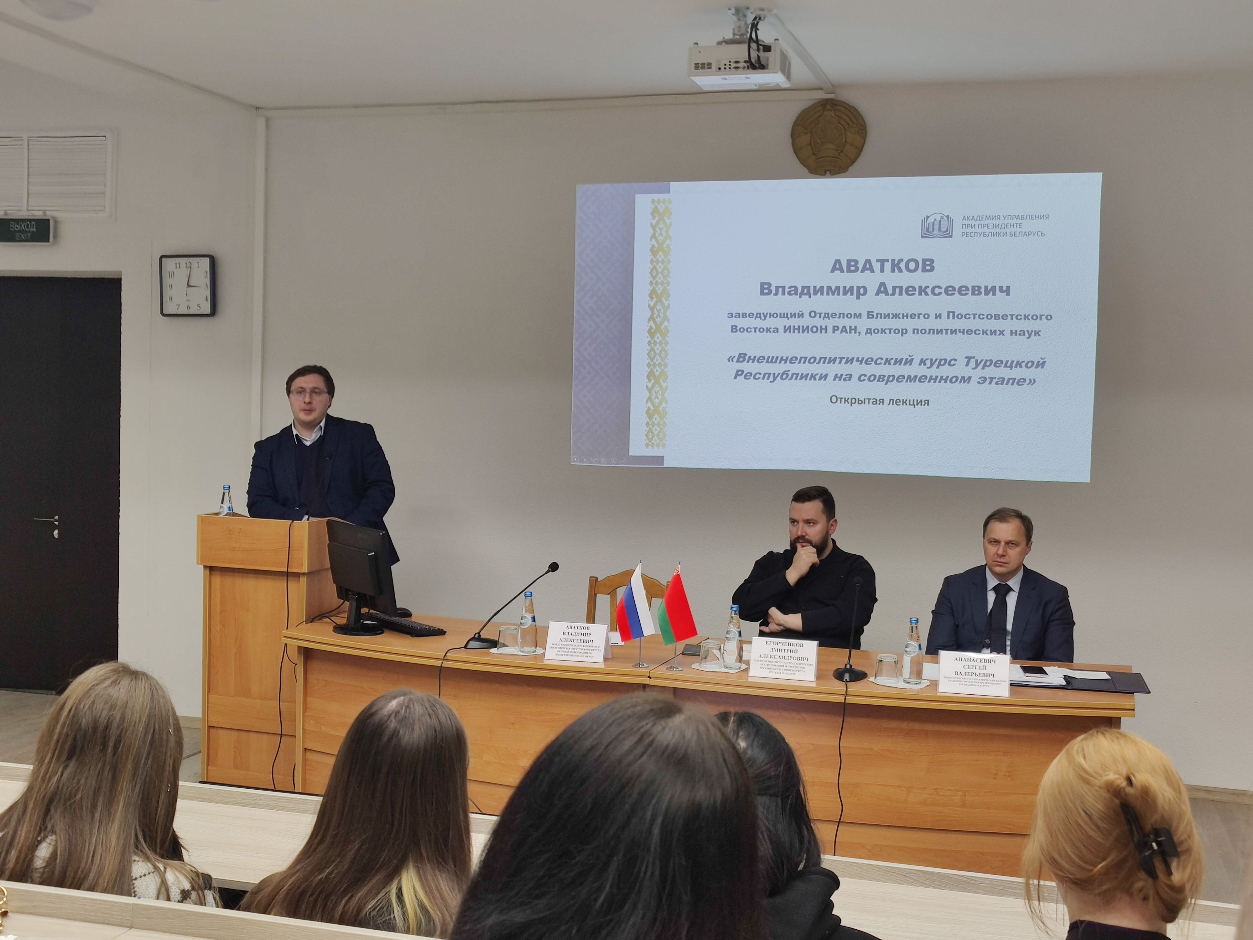 В завершении визита в Академии управления при Президенте Республики Беларусь В. А. Аватков выступил с докладом на тему «Внешнеполитический курс Турецкой Республики на современном этапе». Он рассказал об идейно-ценностных нарративах Турции, а также о взаимодействии России со странами Ближнего и Постсоветского Востока в настоящее время.