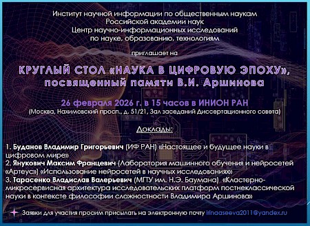26 февраля 2026 года в 15:00 в Зале заседаний Диссертационного совета состоится Круглый стол Центр научно-информационных исследований по науке, образованию и технологиям ИНИОН РАН «Наука в цифровую эпоху», посвященный памяти В.И. Аршинова.