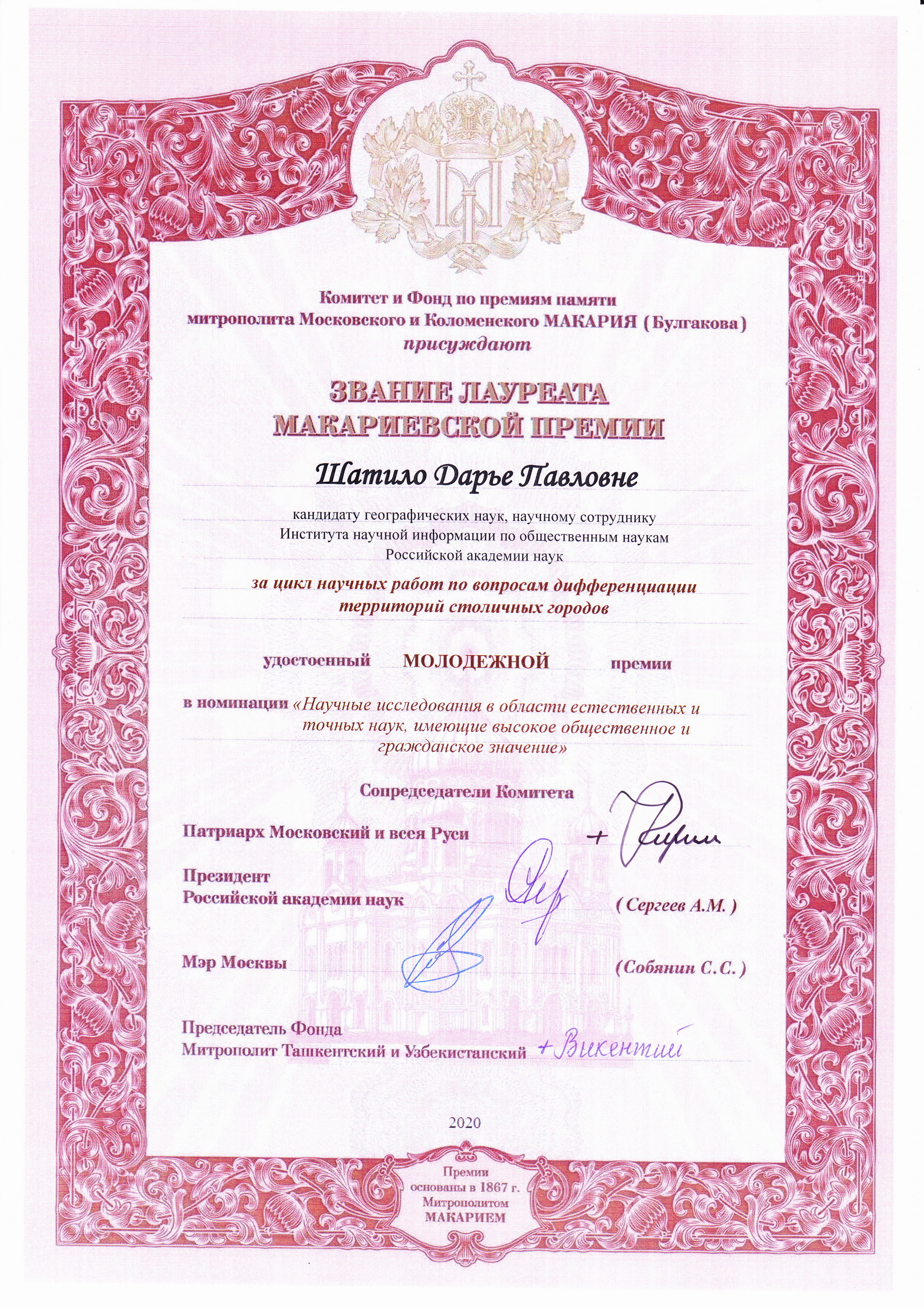 13 ноября 2020 года научному сотруднику Центра междисциплинарных исследований ИНИОН РАН канд. геогр. наук Д. П. Шатило была присуждена Макариевская премия за цикл научных работ по вопросам дифференциации территорий столичных городов. Церемония награждения из-за эпидемии COVID-19 была перенесена и состоялась только нынешней весной. Поздравляем Дарью Павловну!